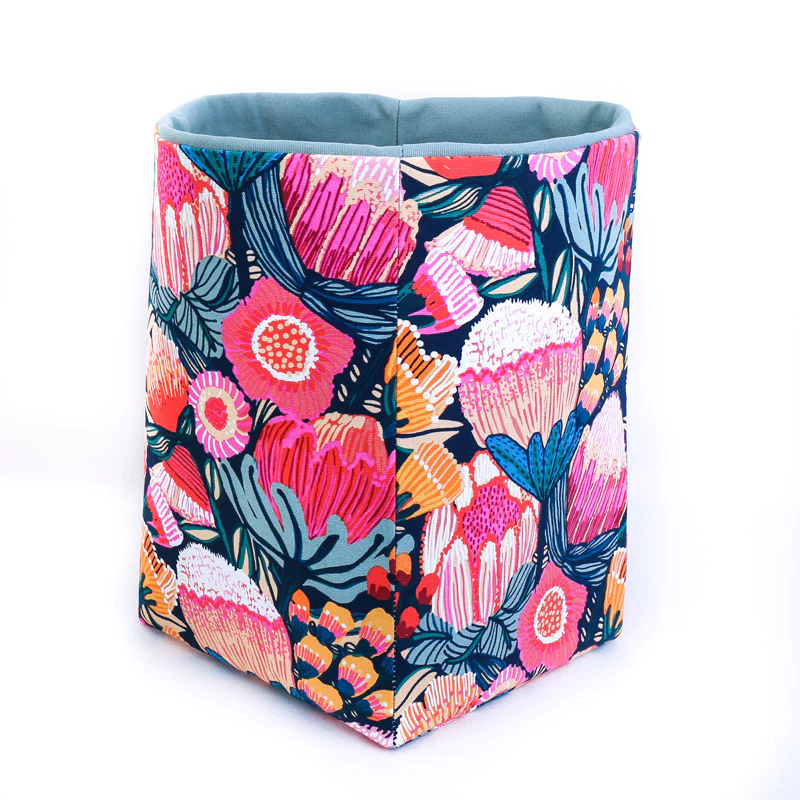 Pink protea blossom storage basket for toys in a modern Australiana Nursery or to display your favourite plant