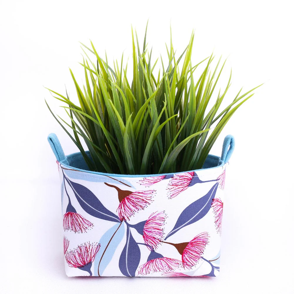 Featuring pink flowering gums and eucalyptus leaves, this mini fabric storage container is very handy to store all sorts of things around your home.